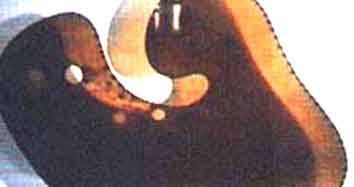 率のためにその色は黒茶色となって、あたかもチョコレートムース様を呈するようにな